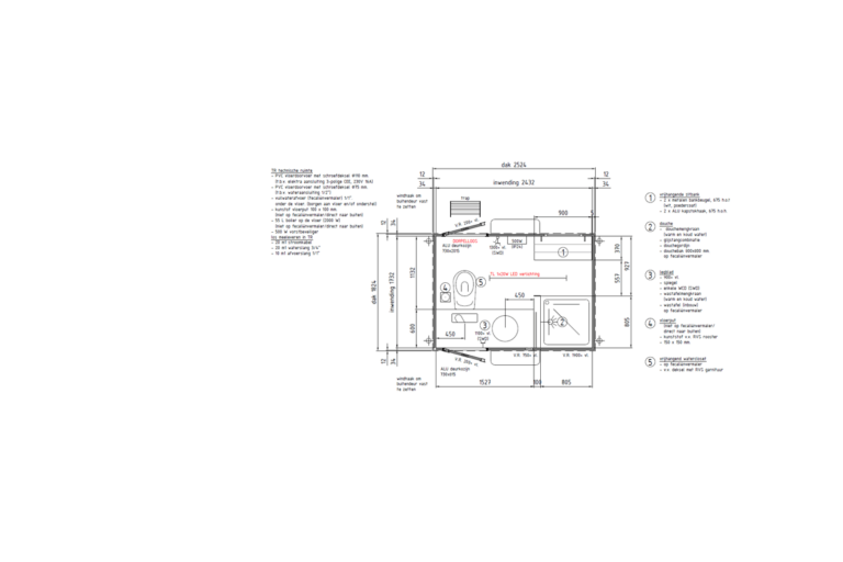 Elektrische verwarmingTL-verlichtingAluminium schuiframen met dubbelglasPVC VloerafwerkingPolyesterDeze badkamerwagen is toegestaan op de weg (door middel van bevestigen van grijze kentekenplaat).