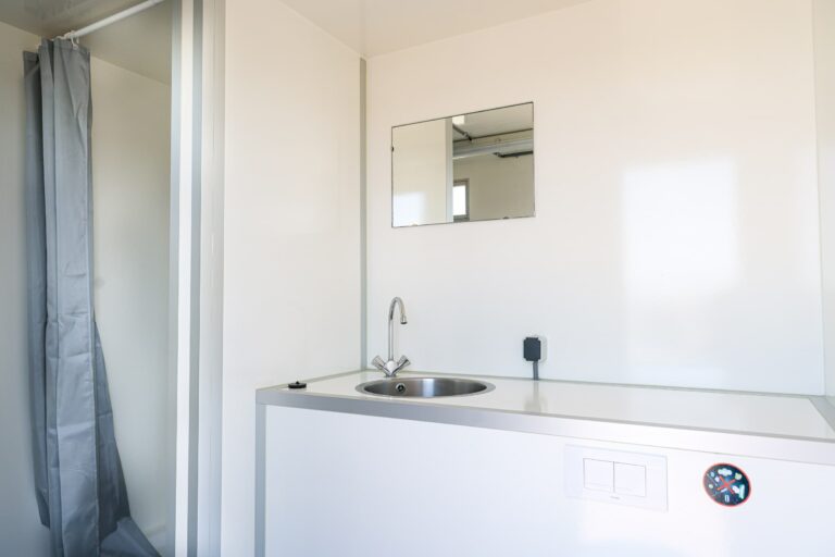 Deze badkamerwagen is ook te koop. Luxe afwerking, inclusief bekabeling en eenvoudig schoon te houden door de polyester wanden. Doordat de wagen verrijdbaar is, is deze eenvoudig naar een volgend project te brengen. Uitermate geschikt als tijdelijke sanitaire ruimte, inclusief douche, toilet en wastafel. In diverse kleuren polyester leverbaar. Mocht deze uitvoering niet de gewenste oplossing zijn, neem dan contact met ons op. Er zijn meerdere indelingen en afmetingen leverbaar.