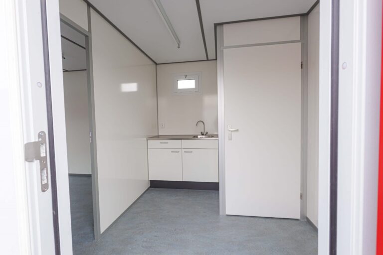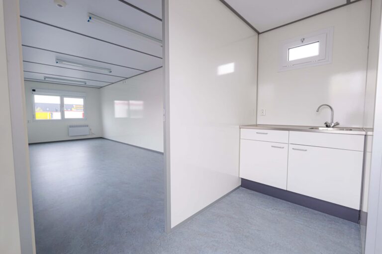 met keuken en toiletDeze ruime kantoorunit biedt volop werkruimte voor tijdelijke kantoorfuncties. De praktische indeling maakt de unit geschikt voor verschillende werkzaamheden op locatie.