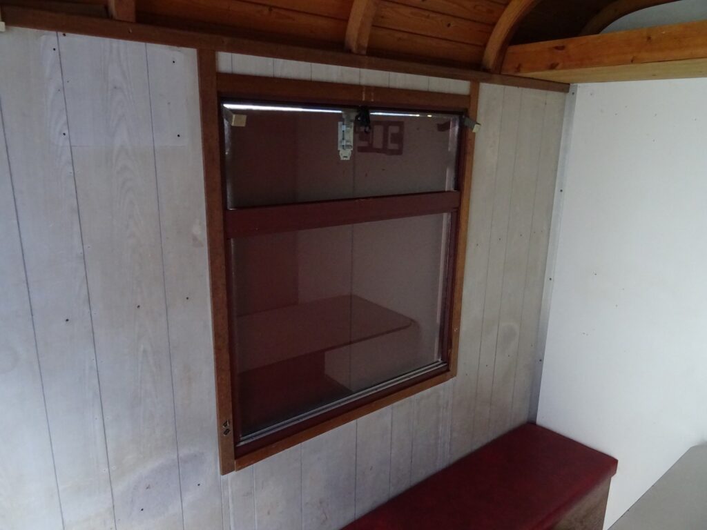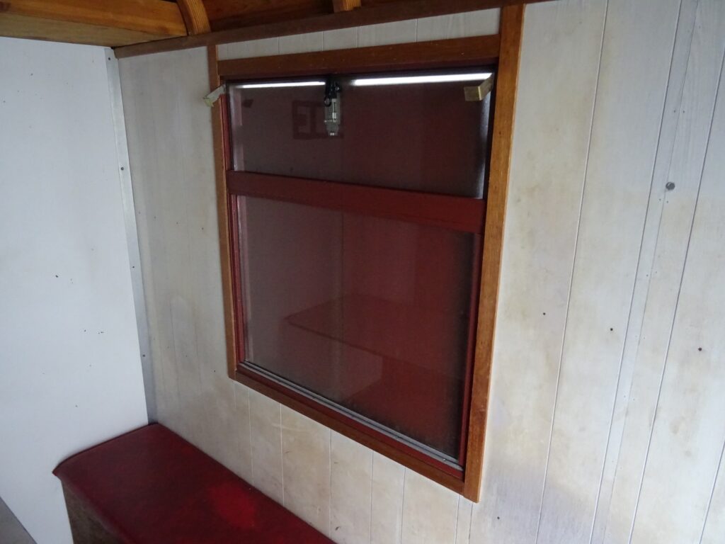 Houten kozijnen met enkelglasHouten vloerGeschilderde houtenbeplatingHouten beplating